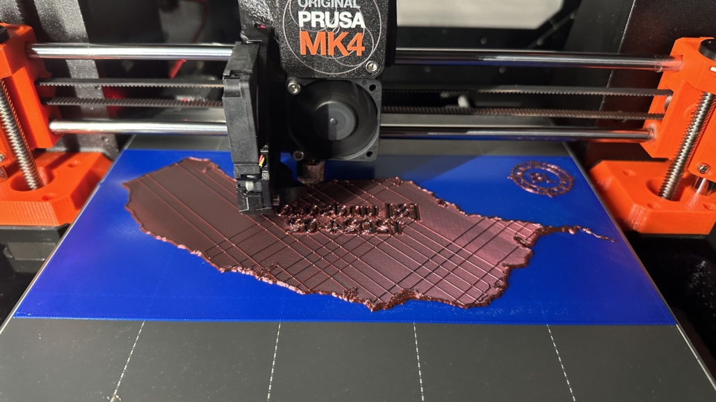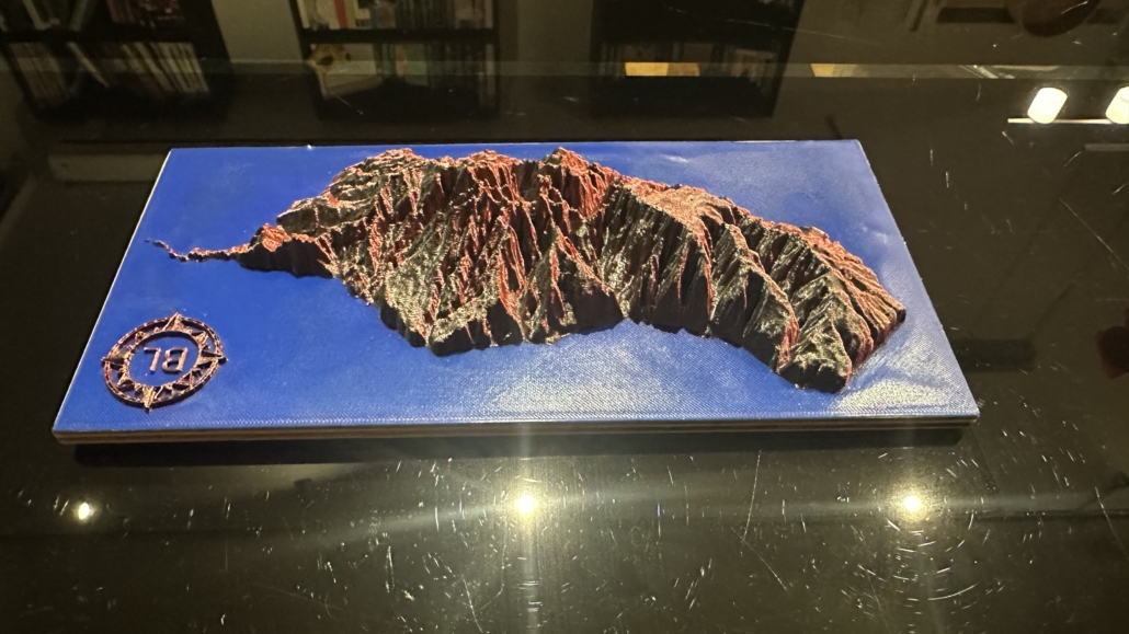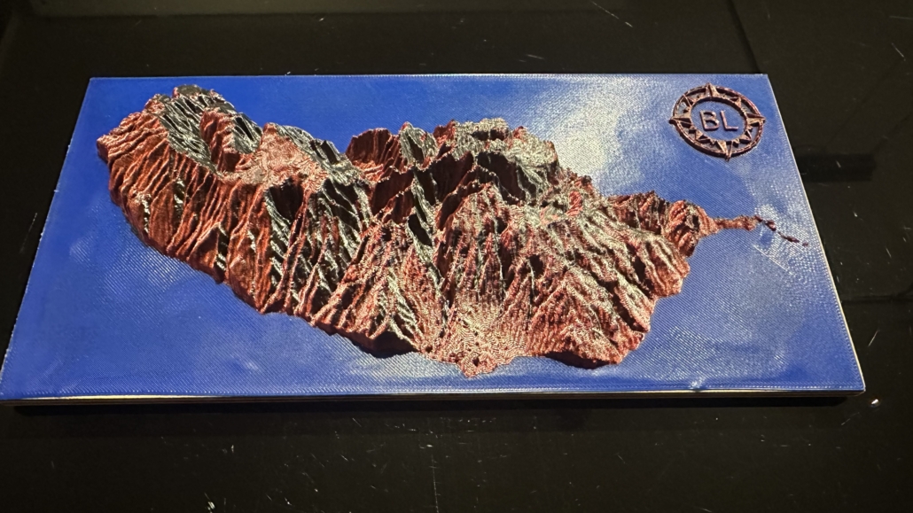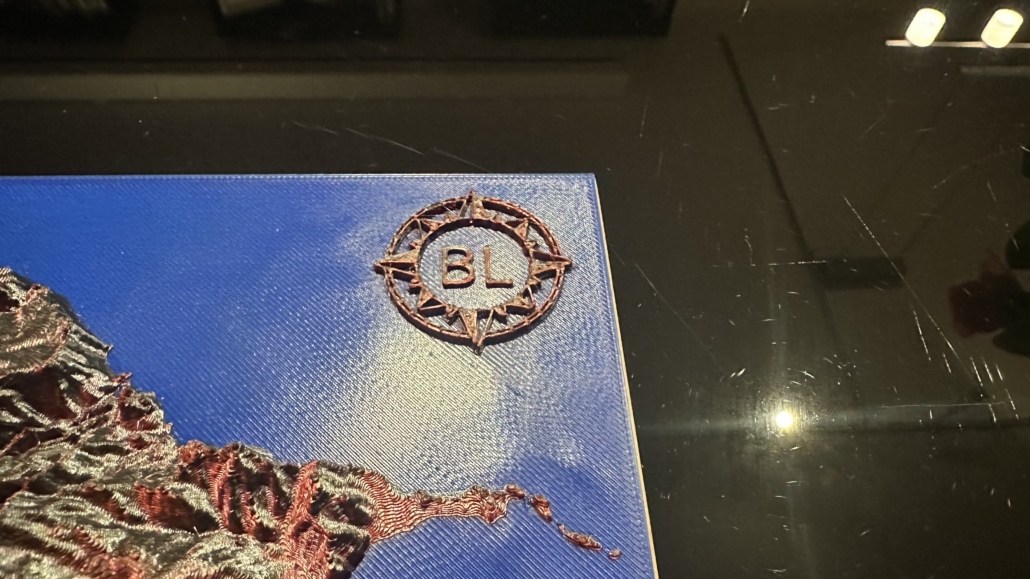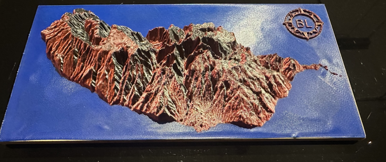 Um die Karte besonders hervorzuheben, habe ich sie mehrfarbig gedruckt. Für die Landflächen habe ich ein faszinierendes Bi-Color-Filament in Rot/Schwarz verwendet, das je nach Lichteinfall unterschiedliche Farbtöne zeigt und der Karte eine dynamische, fast lebendige Optik verleiht. Das Wasser hingegen habe ich in einem satten Blau aus PLA gedruckt, was einen schönen Kontrast zur restlichen Karte schafft.