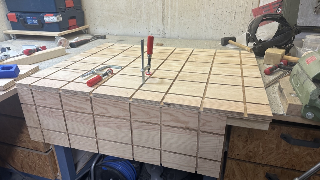 Das Herzstück dieses Arbeitstisches ist ein Raster, das ich mit einem T-Nut-Fräser in die Platte gefräst habe. Dieses Raster ermöglicht es mir, kleine Zwingen von Bessy oder Festool perfekt einzusetzen und Werkstücke sicher zu fixieren. Egal ob ich schleife, säge oder bohre – mit diesen flexiblen Spannmöglichkeiten bleibt alles stabil an Ort und Stelle.