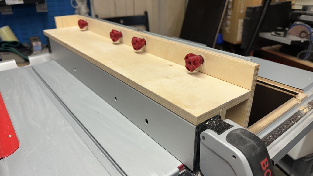 Da ich sicherstellen wollte, dass die Fräse samt Einlegeplatte stabil und nicht nur an den schmalen Enden aufliegt, habe ich in den Sägetisch seitlich Gewinde geschnitten und dort zusätzliche Auflageflächen aus Siebdruck befestigt. Diese sorgen für eine gleichmäßige Verteilung des Gewichts und eine sichere Handhabung beim Fräsen.