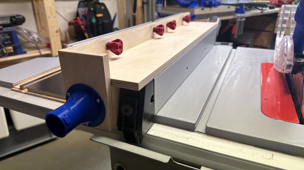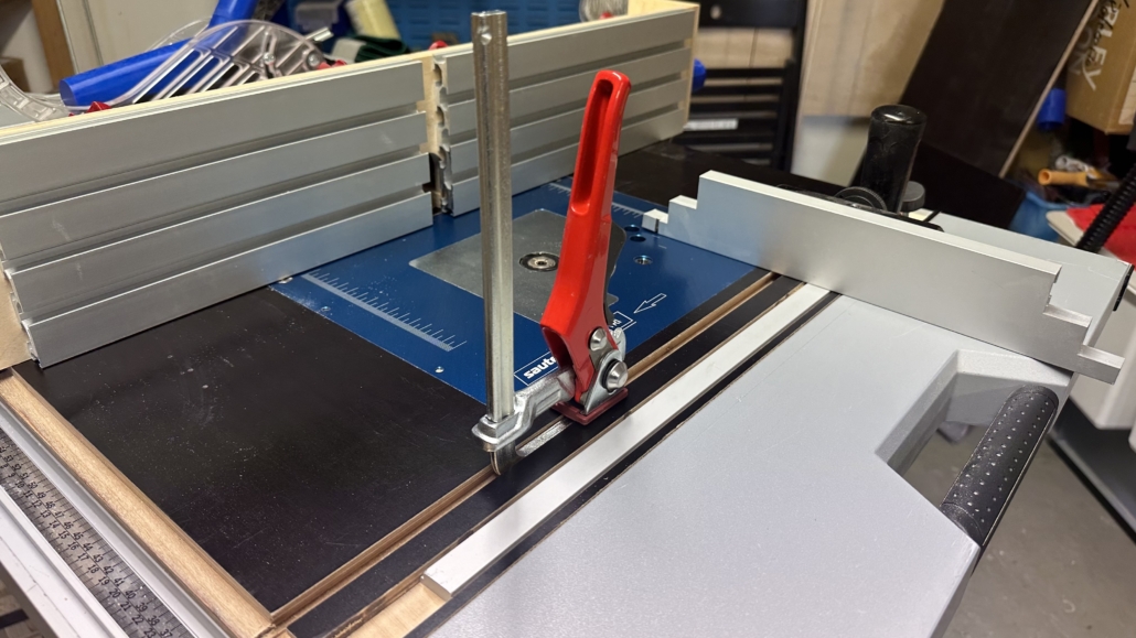 Um auch wirklich effizient und präzise fräsen zu können, habe ich auch den Parallelanschlag der GTS erweitert. Neben der Absaugung habe ich ein Alu-Profil mit Nuten angebracht, an dem ich beispielsweise Federbretter oder Stopp-Punkte befestigen kann. Zudem habe ich in die Siebdrucckplatte noch ein T-Nut (beispielsweise für Bessy Klemmen) sowie eine Breite Nut für die Aufnahme des Winkelanschlags der GTS gefräst. Dieses Setup ermöglicht es mir, verschiedenste Fräsarbeiten mit hoher Genauigkeit durchzuführen.